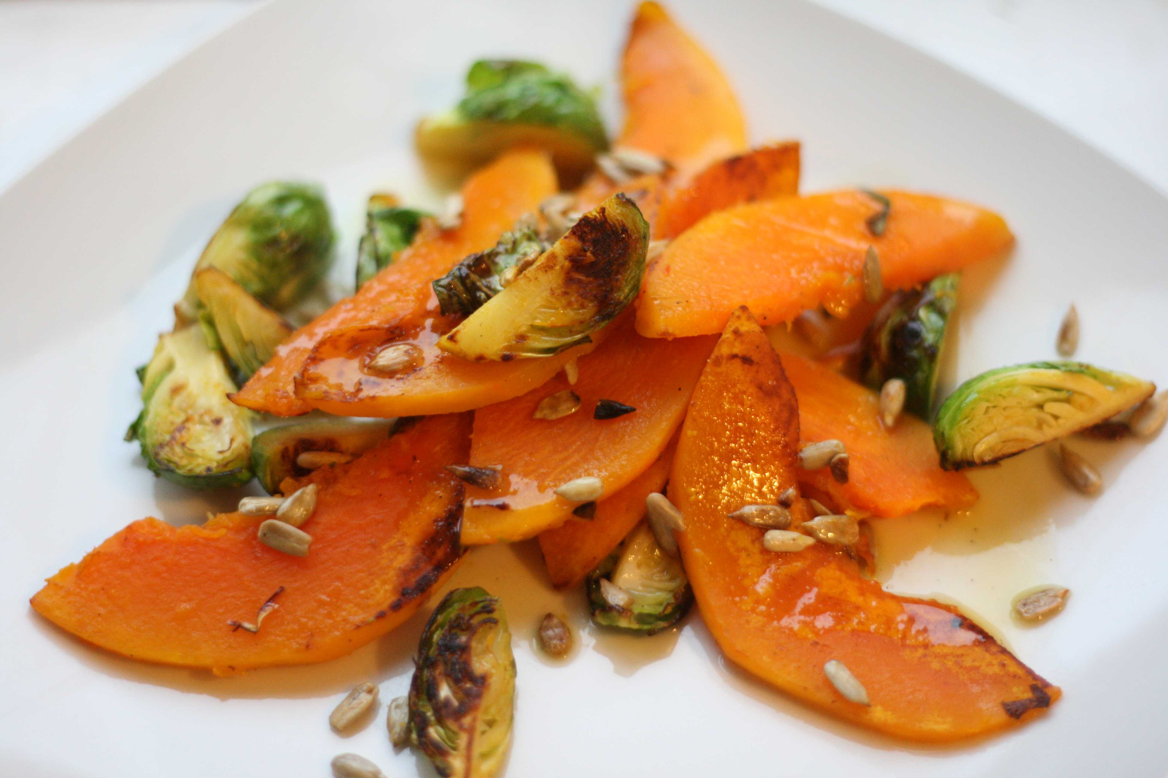 Start med at tænde ovnen på 200 grader. Skræl græskar og skær dem ud i både. Kom dem på en bredepande og hæld olien over dem og kom dem i ovnen i ca. 20-25 min. Skyl rosenkålene og tag evt. de yderste blade af og skær dem i kvarte. Kom smør på en pande og steg rosenkålene og drys en anelse salt over og tilsidst honning eller sirup. De skal steges i ca. et kvarter og gerne ved høj varme, så de bliver sprøde og bitre. Lav dressingen. Rist solsikkekernerne på en pande. Når græskarene er færdige, så bland alle ingredienser og enjoy! //Herdish