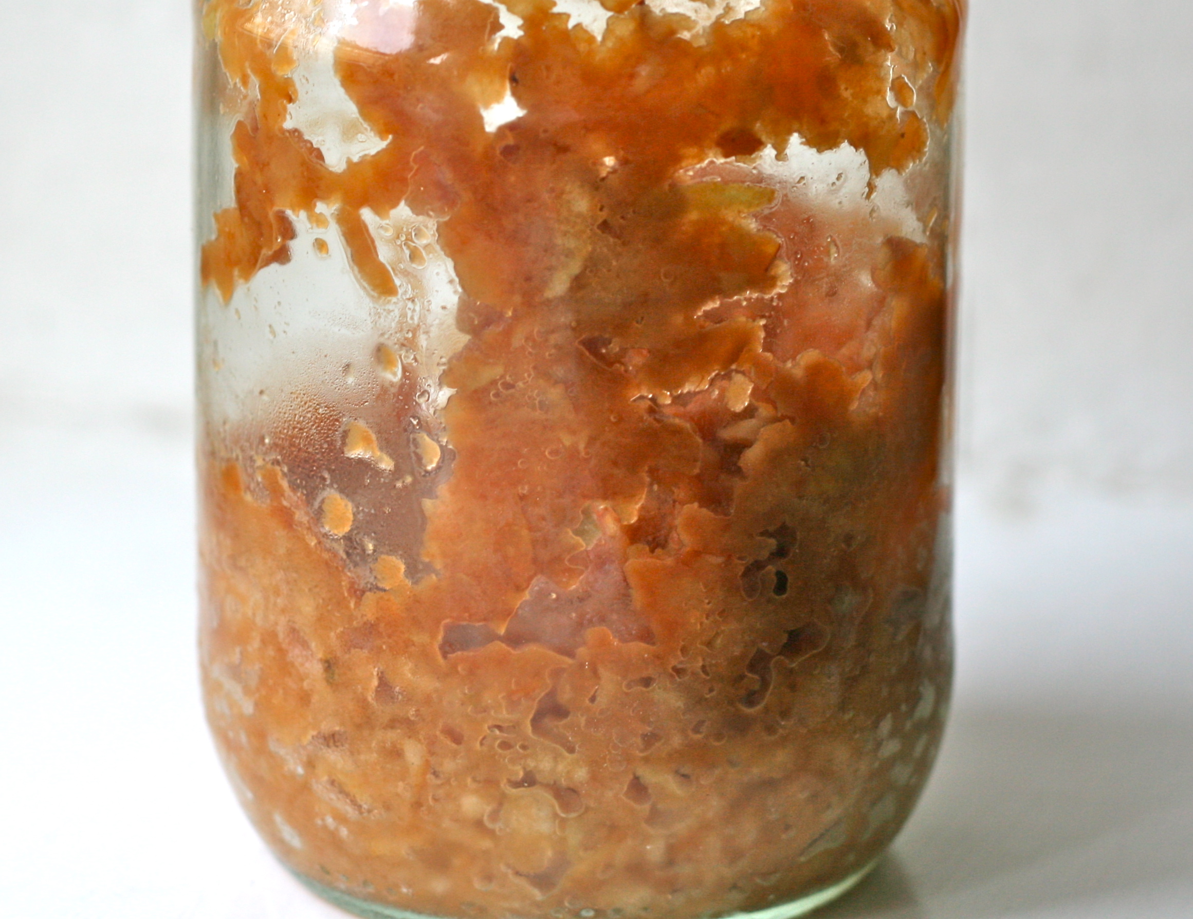 6 revne æbler, som skal stå i en bøtte med låget halvt på i ca 7 dage. Udfordringen lægger måske i, at man skal røre i den hver dag. Herefter stilles den i køleskabet og hver gang du bruger noget af den, så spæder du op med samme mængde, som du tog.
