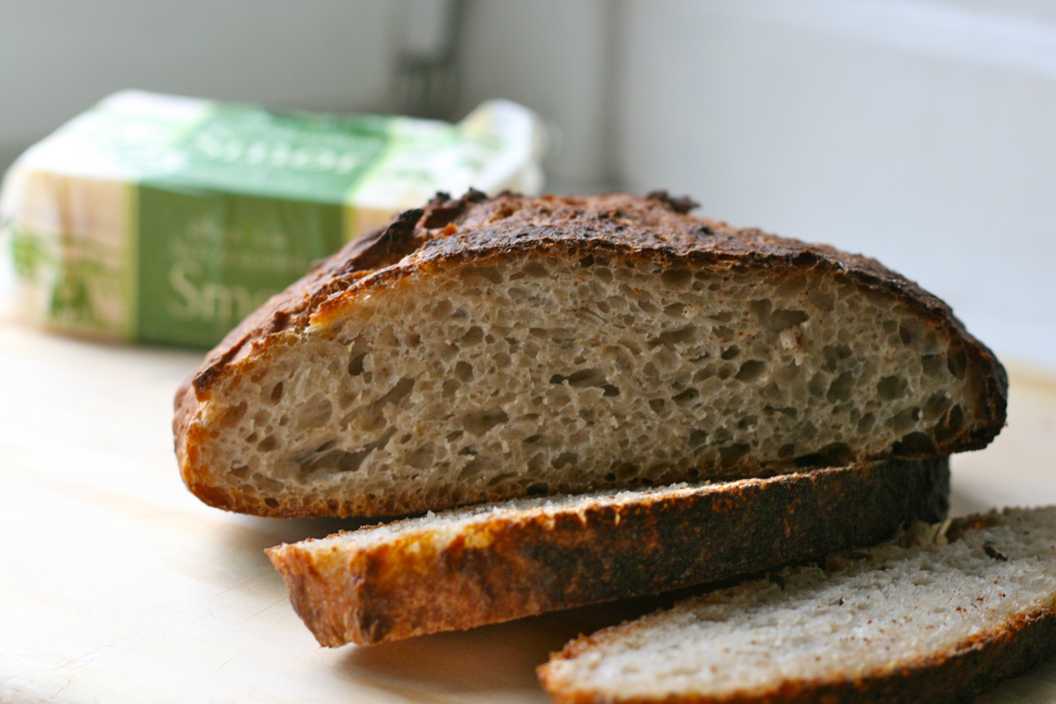 Dejen koldhæves i ca 8-10 timer og skal tages ud minimum en time ingen bagning. Jeg bagte dette brød i min stegeso, så jeg får et sprødt brød (se evt under no knead brød). Bager man det i en gryde, stegeso mm, så skal gryden først opvarmes i 20 min ved 250 grader og herefter hælder du dejen i gryden og så skal den først have 25 min under låg og så tageas låget af og det bages i ydermere 15 min. Kommes på en rist herefter og nydes med smør eller andet godt