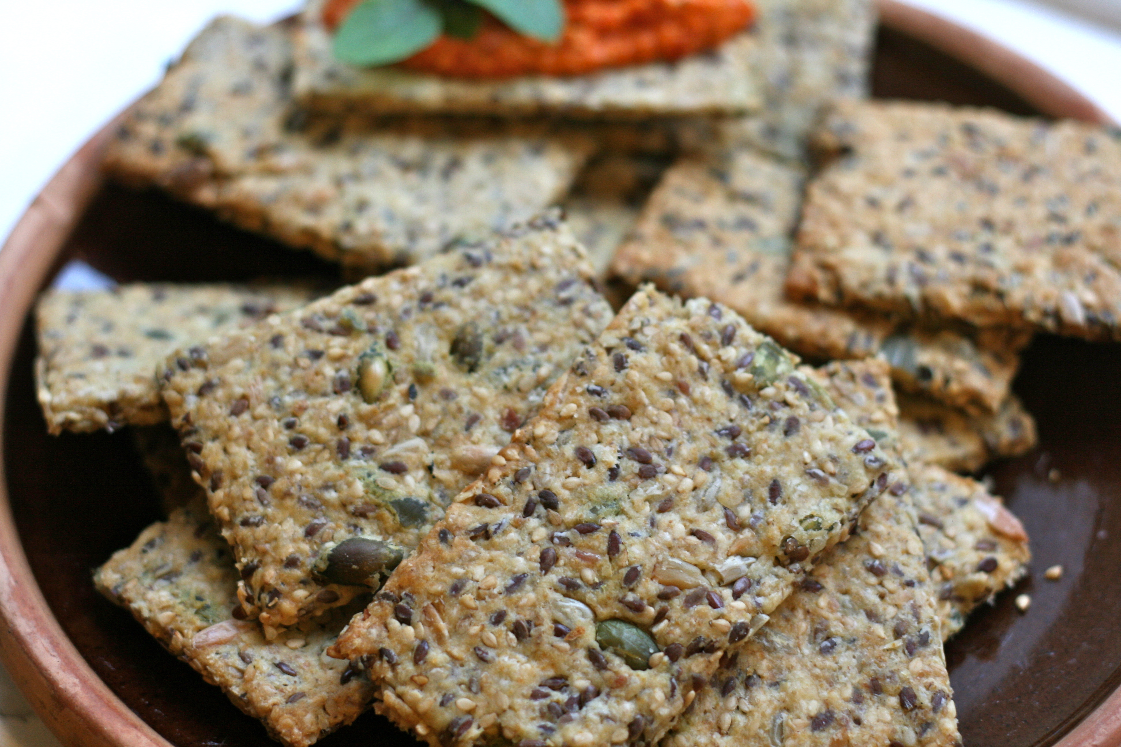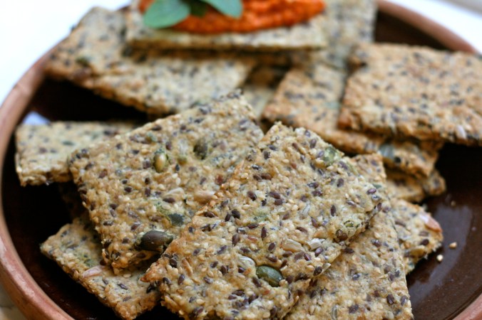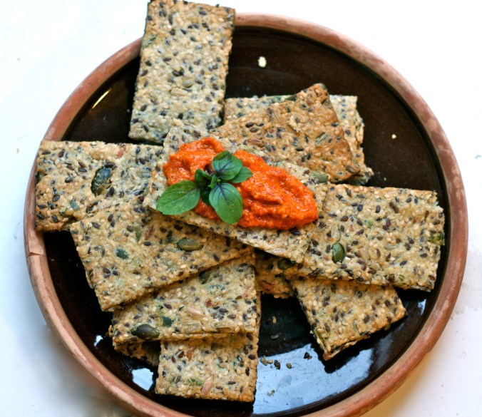 Knækbrødene nydes enten som snack ellers egner de sig også godt som en forret, hvor de fx toppes med krebsehalesalat, røget ørredcreme eller fx denne peberfrugt creme som på billederne (se under tapanader)