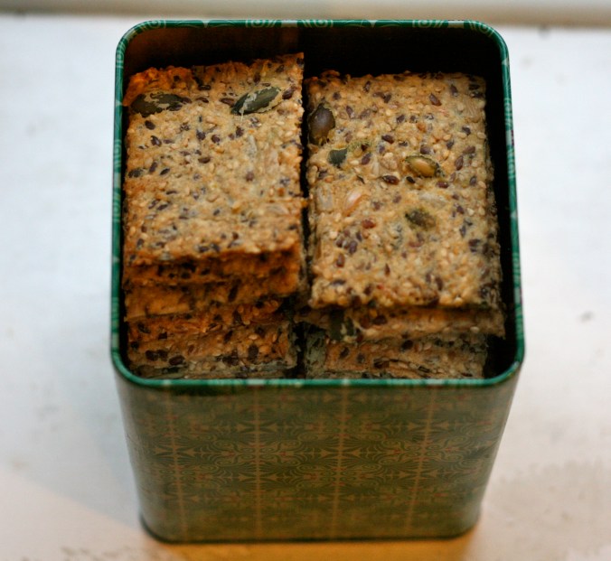 Dette er første forsøg med hjemmelavede knækbrød, som faktisk blev ret vellykket. Jeg fandt en opskrift på nettet, som jeg lavede lidt om på til det bedre. Kernerne smager godt igennem, og får nærmest en popcornsagtig smag. Hvis man gerne vil undgå dette, så giv dem lidt kortere tid i ovnen ved lavere varme.