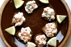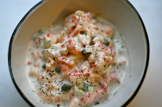Lav først dressingen, dvs bland græsk yoghurt, mayonæse, dild dressing, finthakket dild, hvidløg og salt og peber. Hak herefter krebsehalerne og kapers groft og hak løgene meget fint. Bland det hele sammen og servér det evt. på små stykker ristet brød til en forret eller som en del af en tapas – pynt med dild, kapers og citron, enjoy!