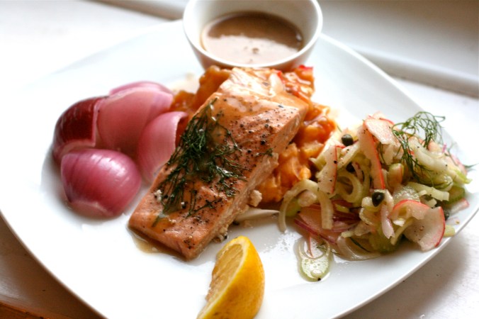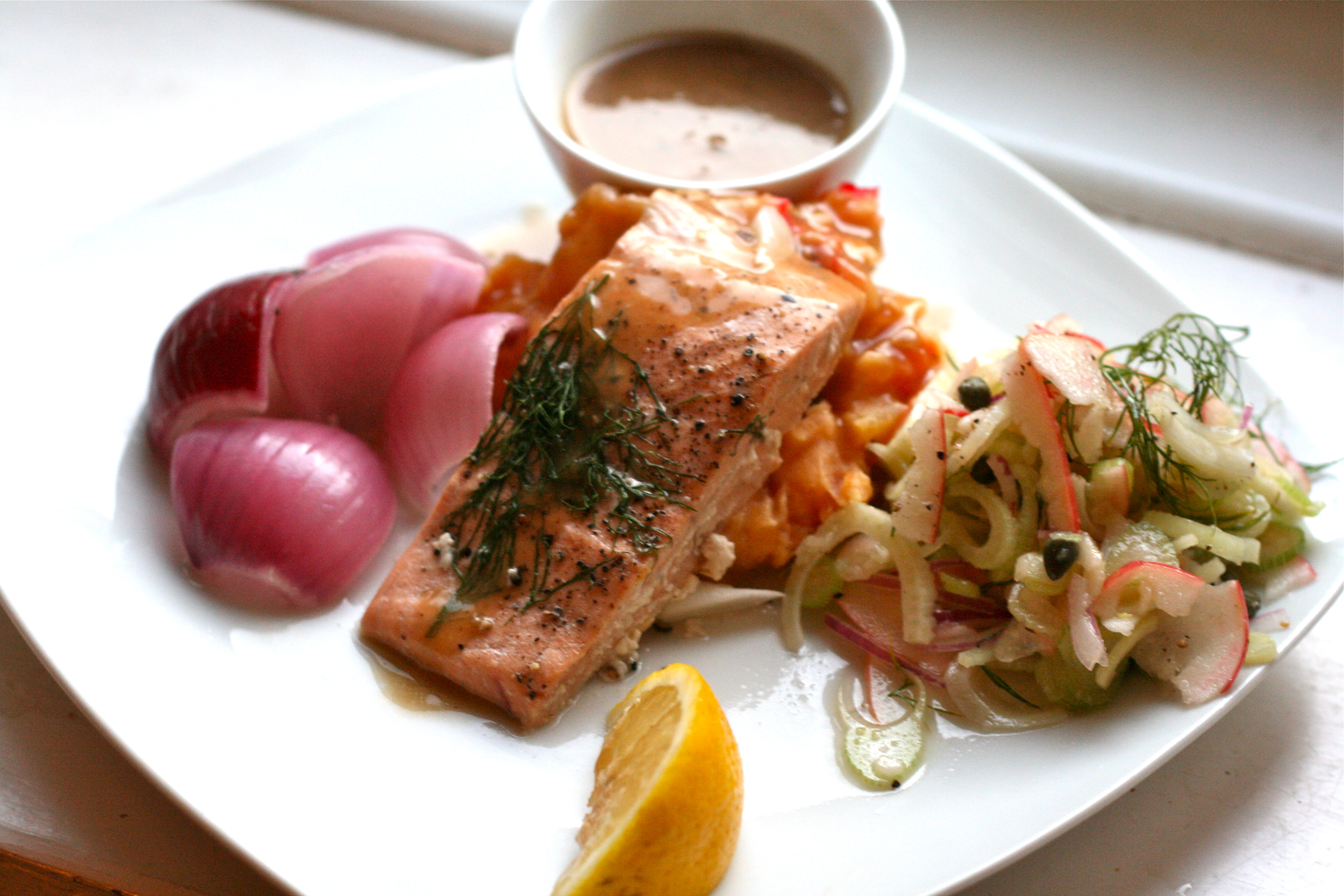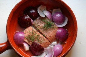 Laks med frisk dild og rødløg: