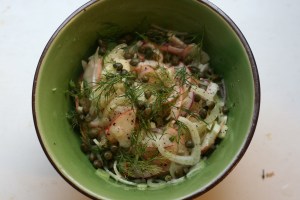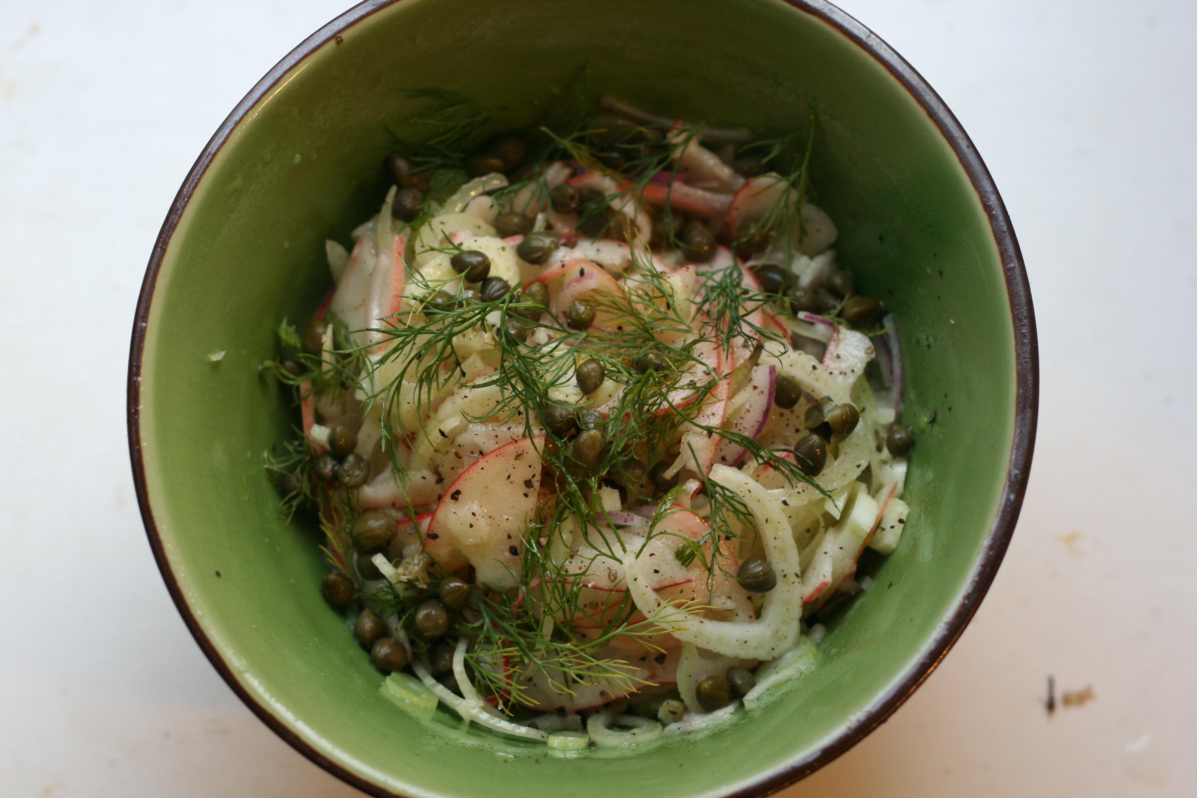 Halvér fennikel og skær dem på tværs i fine skiver. Skær herefter æblet i både (så der bliver ca 20- 24 skriver i alt). Dild hakkes fint og kapers det samme og kommes i salaten. Inden servering kommes dressing over.