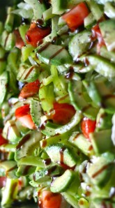 Skær grønsagerne ud. Jeg tager altid kernerne ud af agurken, så salaten ikke bliver for vandet. Rødløgene snitter jeg i halve tynde løgringe – hvis man snitter dem i tern falder de nemlig altid ned i bunden af salaten. Dressingen over til sidst og kør lidt balsamico over inden servering.