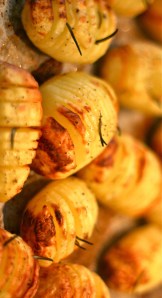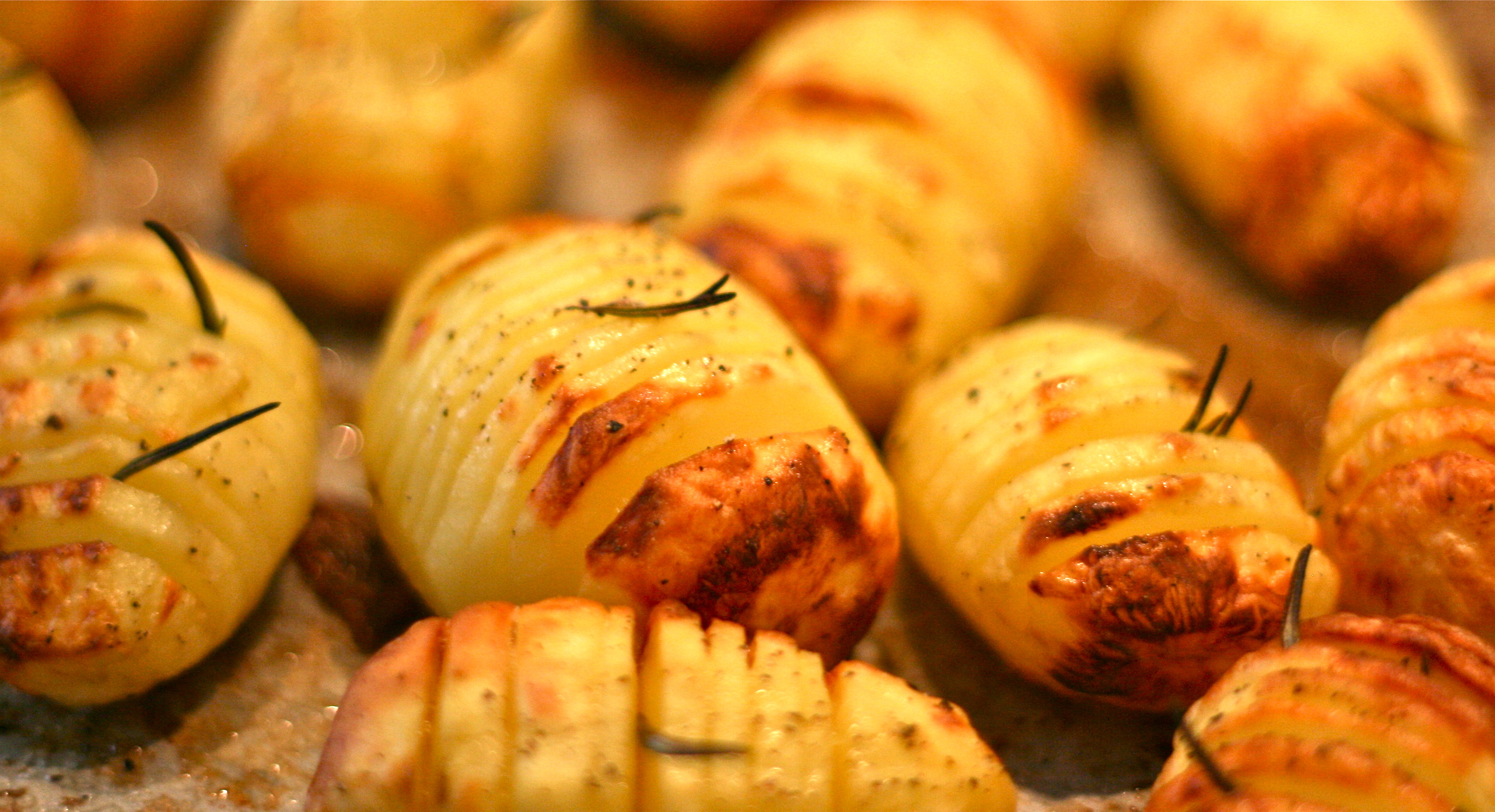 Hasselbagte kartofler var et hit hjemme hos mig der i 90’erne. Start med at tænde ovnen på 180 grader. Skræl kartoflerne (antal alt efter, hvor mange personer, I er) og skær dem herefter. Jeg stiller altid kartoflen i midten af to lige store skærebrætter og så hakker jeg ellers små riller i kartoflen. Smører den med olie, salt, peber og frisk rosmarin (eller andre krydderurter) og så i ovnen ved 180 grader i 40-45 min.