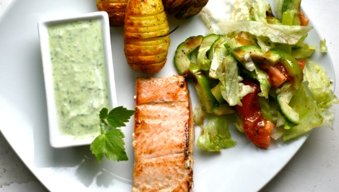Persillepesto (se opskrift under “Aftensmad” herunder “Persillepesto”). Pestoen blandes op med et surmælksprodukt (jeg bruger gerne almindeligt yoghurt natural), hvidløg, salt og peber.