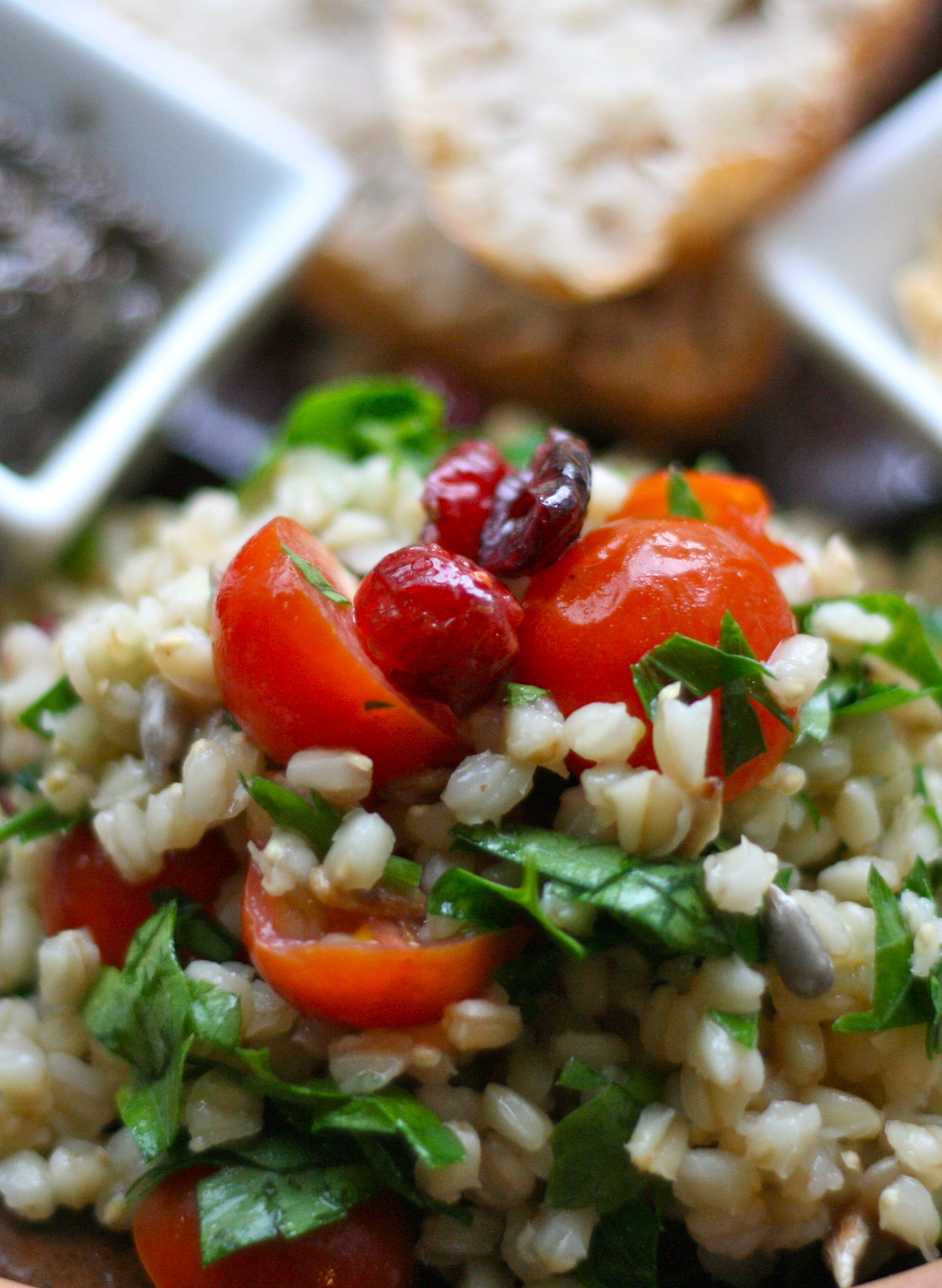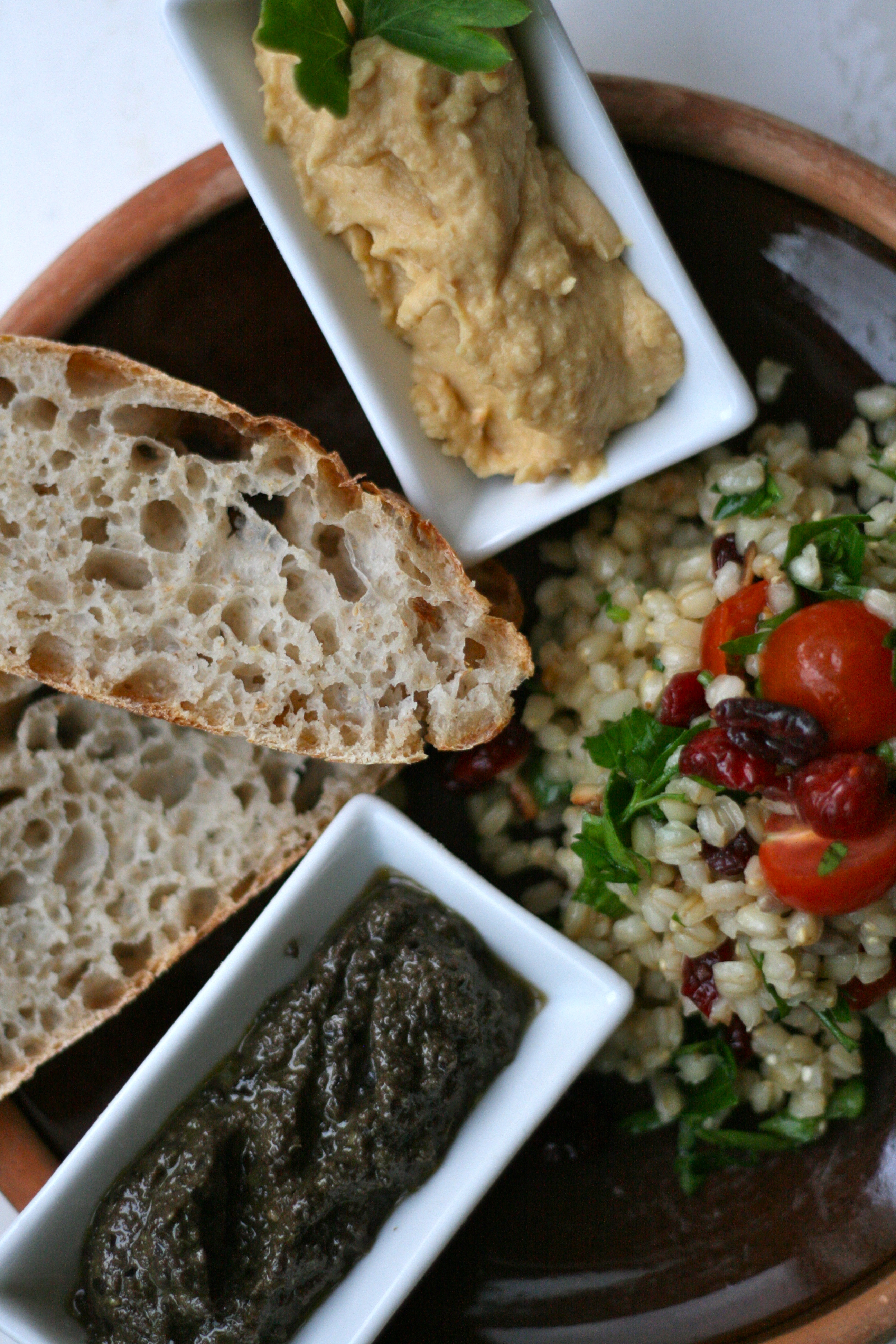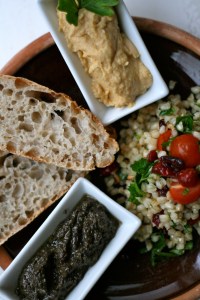En let og lækker frokost (kan også serveres til aften) i tapas-stilen. Salaten var super lækker og nem at lave og humussen er proteinholdig kan gå for kød. Brødet er en gennemtæsket hvede-/rugsurdej.
