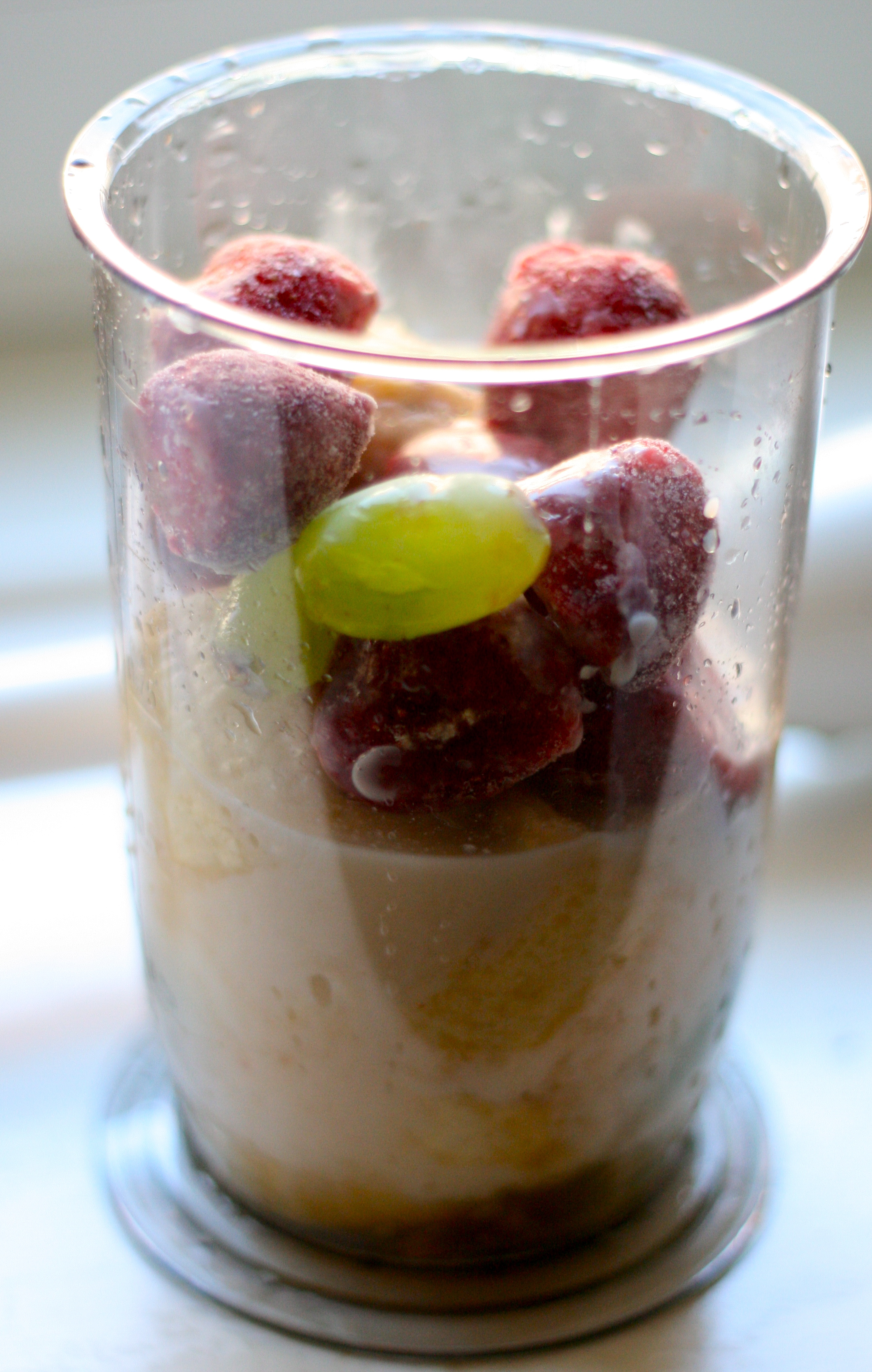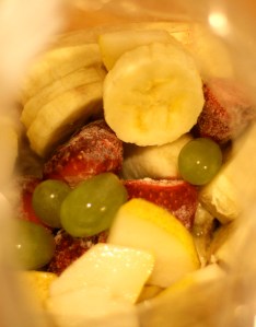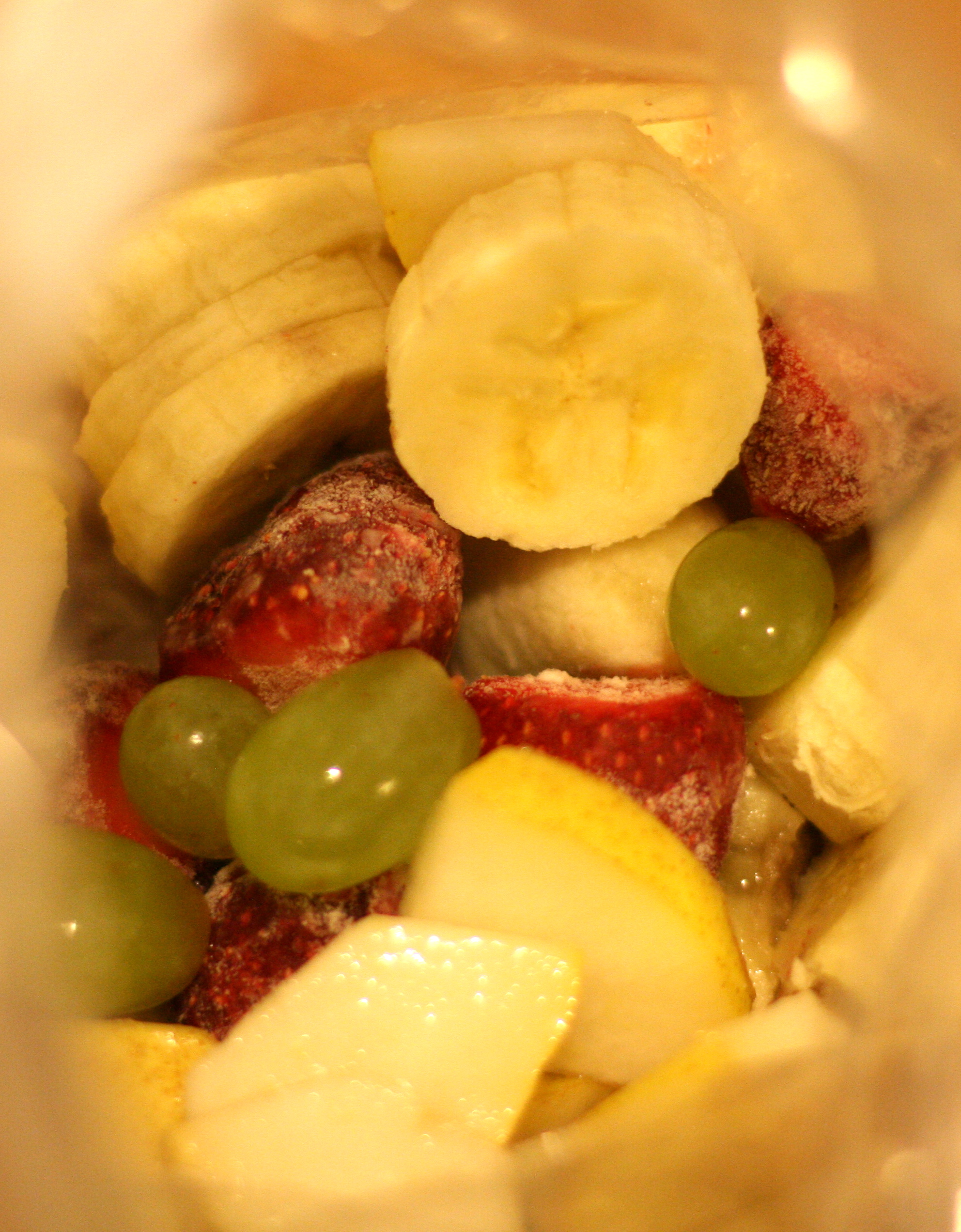 Jeg er aldrig særlig systematiseret, når jeg laver smoothies. Som det ses på et af billederne, så laver jeg en blanding af forskellige frugter, skærer/skræller dem, kommer dem i en pose og så fryser jeg det ned. Jeg gør det oftest, hvis jeg kan se, at fx bananer er på nippet til at blive brune (eller andet frugt, som man ikke får spist “råt”).